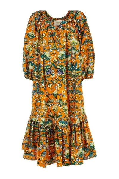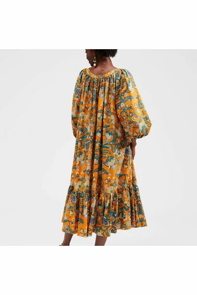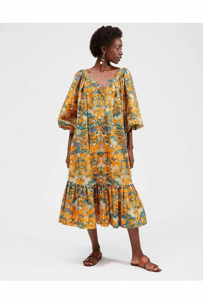 Pak een klap in onze gezwollen volksjurk. Enorme ballonmouwen en een gelaagde bubbelrok maken een oversized, statement silhouet, terwijl onze nieuwe Life Arancia -print (J.J. het zo leuk vindt dat ze het op haar gordijnen had gedrukt) geeft het het dubbele van de impact. Extra ruim, totaal comfortabel en lichtgewicht in katoenen popeline, deze jurk kan open worden bij de nek, of vastgebonden voor meer dekking.