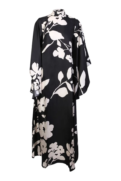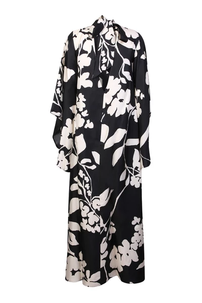 Hoge kraag. Lange mouwen. Top Tie Bevestiging. All-over bloemenprint. Vloer-lengte. Kleur: zwart/wit, materiaal: 100% zijde, gemaakt in ItaliΓ«,