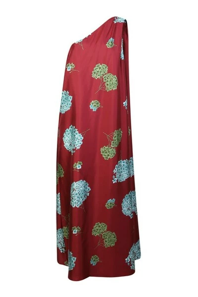 Een schouder. Bloemenprint. Twee zijspoorzakken. CONCELEAD SIDE ZIP VASSINGEN. Lange lengte. Kleur: Bordeaux ,, Materiaal: 100% zijde, gemaakt in ItaliΓ« ,,