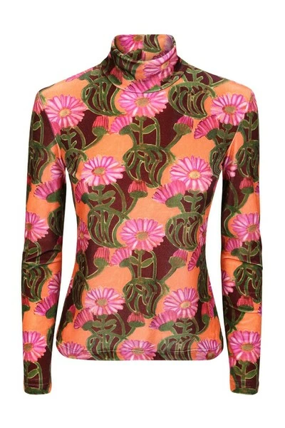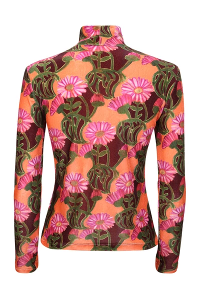 Coltrui. Lange mouwen. All-over bloemenprint. Strekontwerp. Flueel. Kleur: oranje/ fuxia/ multicolor, gemaakt in ItaliΓ«, materiaal: 85% polyamide 15% elastaan, productcode: 183290, merkcode: shi0030 vel006 ger0002,