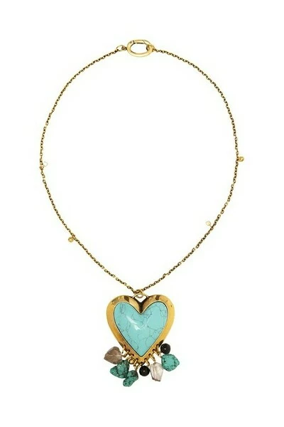 De Cuore Grande ketting is een echt hartverwarmend stuk. Het heeft een hart gemaakt van hars, is verfraaid met rozenkwarts en turquoise stenen hangers opgehangen aan het hart en heeft een vergulde ketting. Er is iets rustgevend aan het hebben van een gigantisch hart met halfedelstenen rusten op je borst, vertrouw ons, schat.